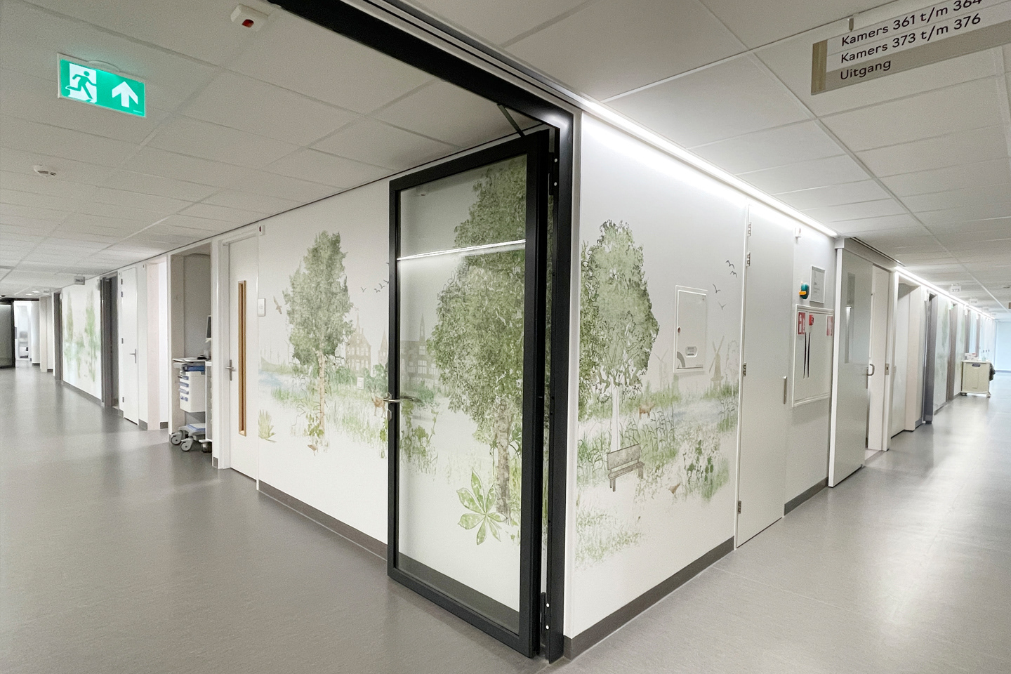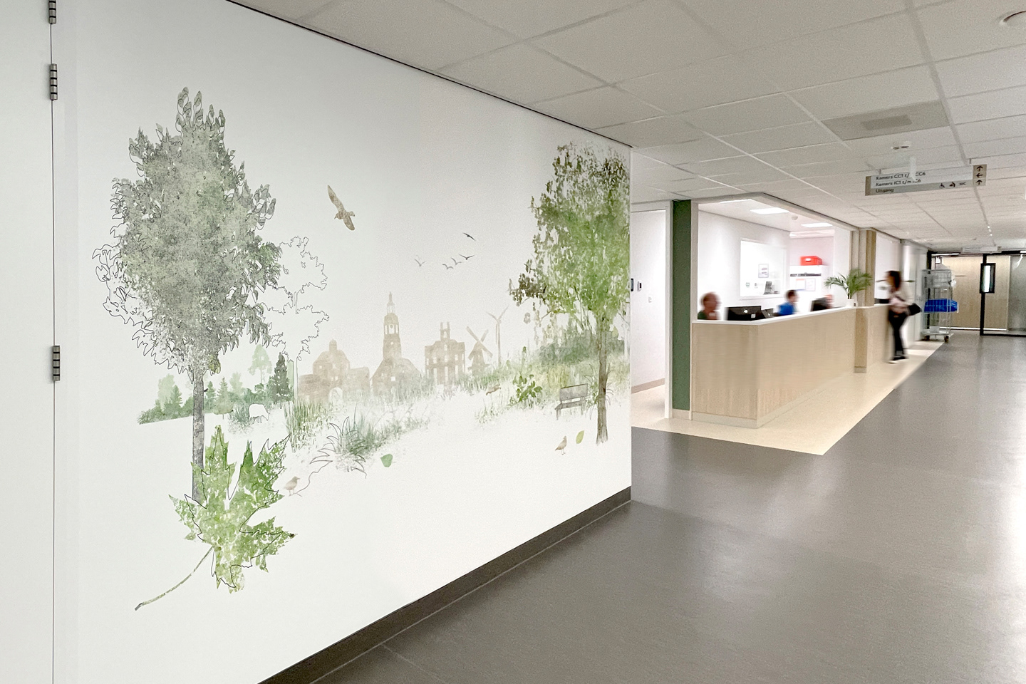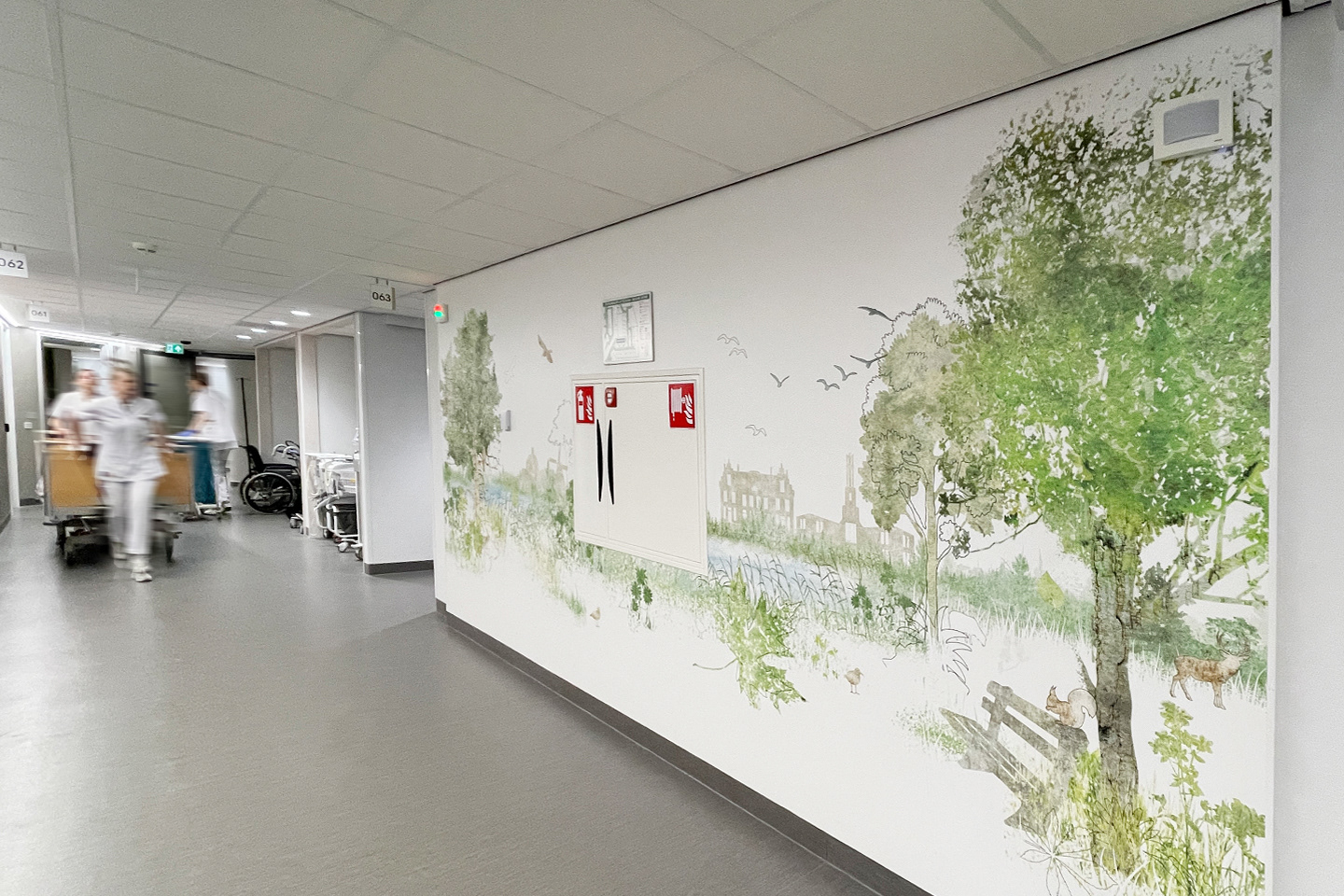 Voor het st Jansdal ziekenhuis ontwierp ik een grafische stijl die aansluit bij de grafische stijl van de kinderafdeling, maar met een eigen identiteit. Waarbij de nadruk bij de kinderafdeling op de dieren ligt, ligt hier de focus op het landschap. Iedere afdeling heeft een unieke samenstelling van gebouwen uit de omgeving, die in wisselende samenstelling (als verbeelding van de omliggende dorpen) op de horizon te zien zijn. Dit zorgt voor herkenningspunten voor de patiënten die uit Harderwijk en omgeving komen.