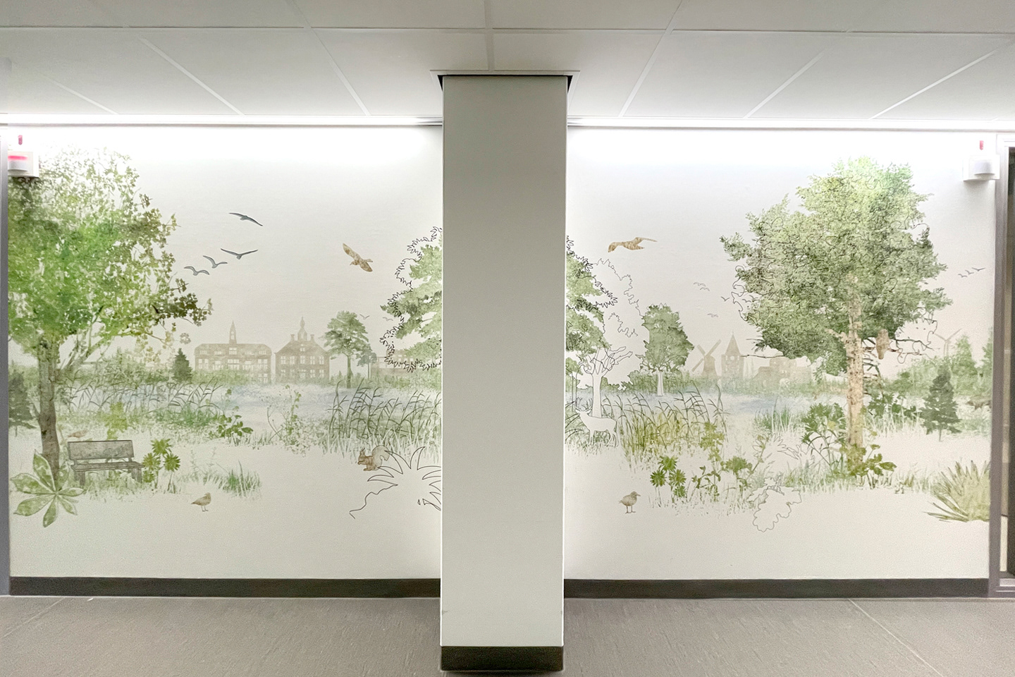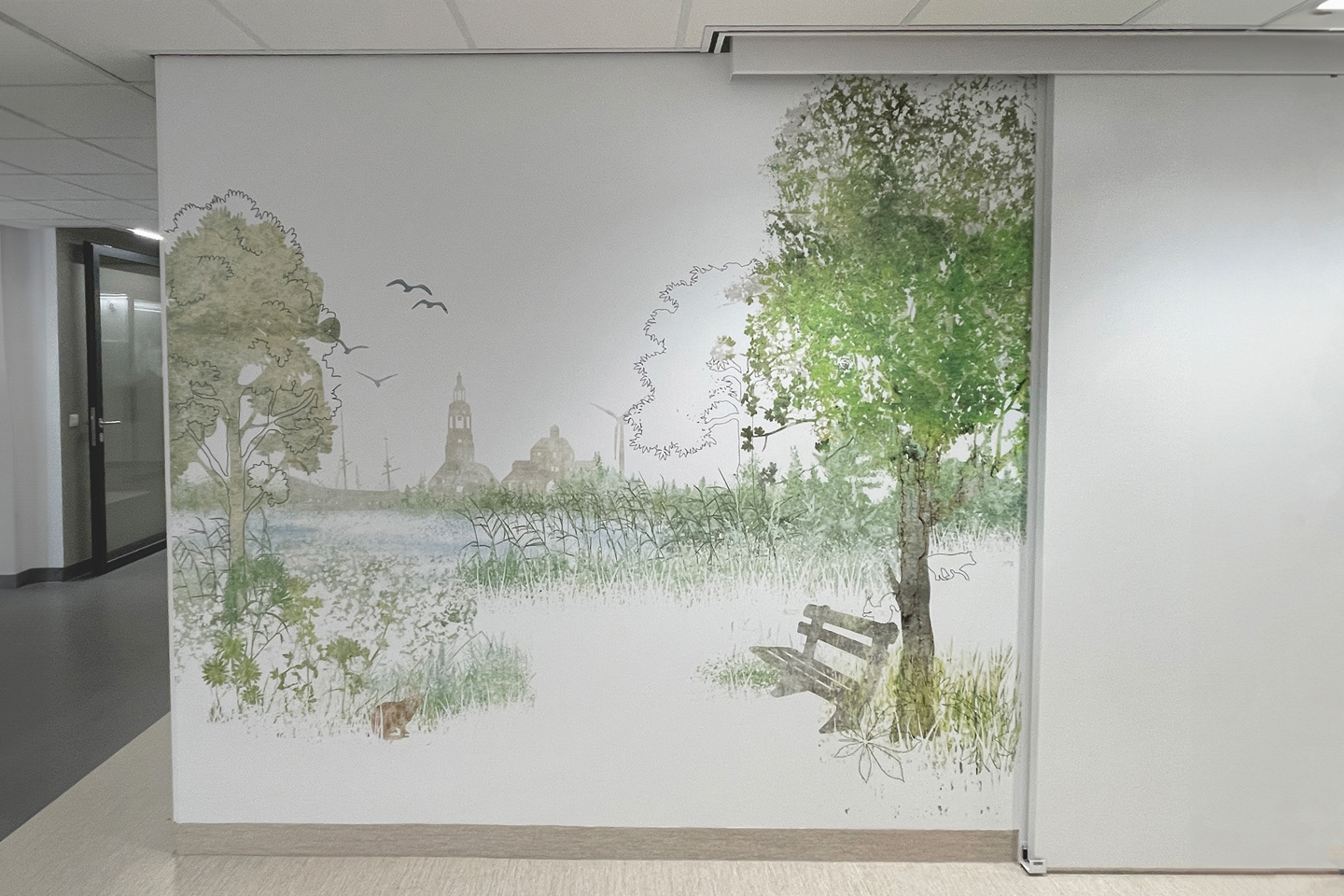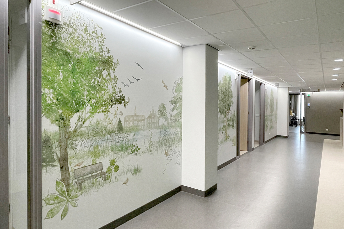 Voor het st Jansdal ziekenhuis ontwierp ik een grafische stijl die aansluit bij de grafische stijl van de kinderafdeling, maar met een eigen identiteit. Waarbij de nadruk bij de kinderafdeling op de dieren ligt, ligt hier de focus op het landschap. Iedere afdeling heeft een unieke samenstelling van gebouwen uit de omgeving, die in wisselende samenstelling (als verbeelding van de omliggende dorpen) op de horizon te zien zijn. Dit zorgt voor herkenningspunten voor de patiënten die uit Harderwijk en omgeving komen.